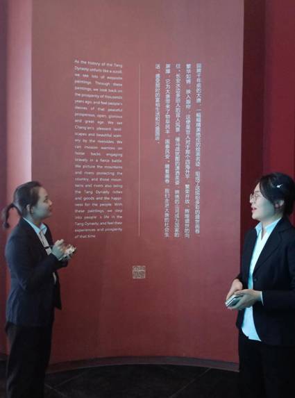 首先,大家参观了“又见大唐”的“盛世画卷”展厅。随着画卷,我们走进大唐的社会生活,感受那时的富裕生活和兴盛国运。透过展览,又见大唐盛世,感受大唐文明的文化基因,又见东方古国的延绵不息,太平盛世。随后大家来到“浩荡书风”展厅,姿态万千的笔划记录着国家兴盛、威德远播的全盛图景,字里行间反映出人们对世界的认知和信仰。在大家醉心于大唐盛景的同时,也不忘细心记录,讲解结束后,在必赢3003no1线路检测中心刘熠副院长与万平老师的指导下,同学们分成小组,讲解自己感兴趣的展品,并进行现场口译实践。体现出学院着力构建全程、全员、全方位的“课程思政”格局,贯彻落实培养语言功底扎实、人文与科学素养深厚,能够担当民族复兴大任的复合型英语专业人才的教学目标。