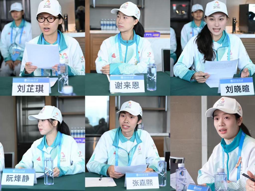 刘郎整体介绍了米兰残特奥会志愿者上岗情况和学校工作开展情况。残特奥会“小海豚”志愿者中文学院刘晓暄、英文学院阮烽静、英教学院谢来恩、信息学院杨家欢、公开学院刘芷琪、张嘉熙作为各个岗位的志愿者代表,分享了自己在残特奥会服务的心得感受。志愿者们感谢学校创造的服务机会和提供的各方保障,纷纷表示将带着学校的认可与鼓励,以更饱满的热情、更专业的态度圆满完成后续服务任务。