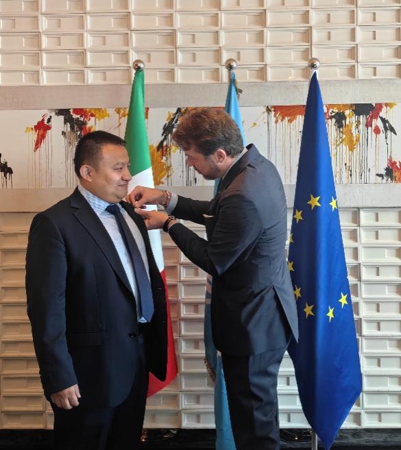 2025年10月24日,意大利驻广州总领事馆举办授勋仪式。德派罗(Valerio De Parolis)总领事宣读塞尔焦·马塔雷拉(Sergio Mattarella)总统的授勋令,并代表意大利政府向米兰区域国别学院(国际关系研究院)副院长臧宇教授颁发“意大利之星”骑士勋章和由总统亲笔签署的授勋证书,表彰其在意大利语言文化传播和当代意大利研究等方面作出的重要贡献。